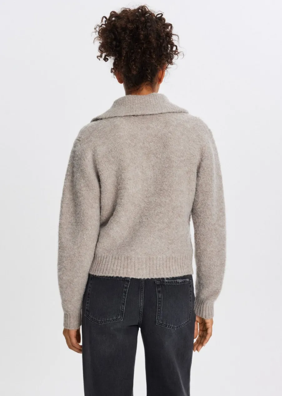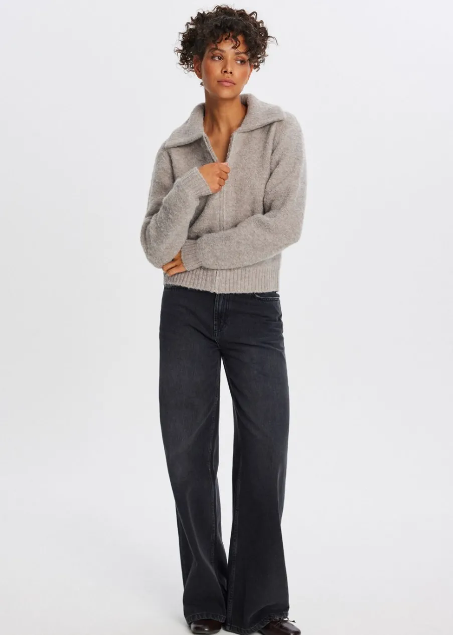 Dit bouclé vest heeft lange mouwen, een kraag en een ritssluiting aan de voorkant. Het jasje is gemaakt van een bouclé stof en heeft ribboorden bij de mouwen en onderkant. Mooi te combineren met een broek.