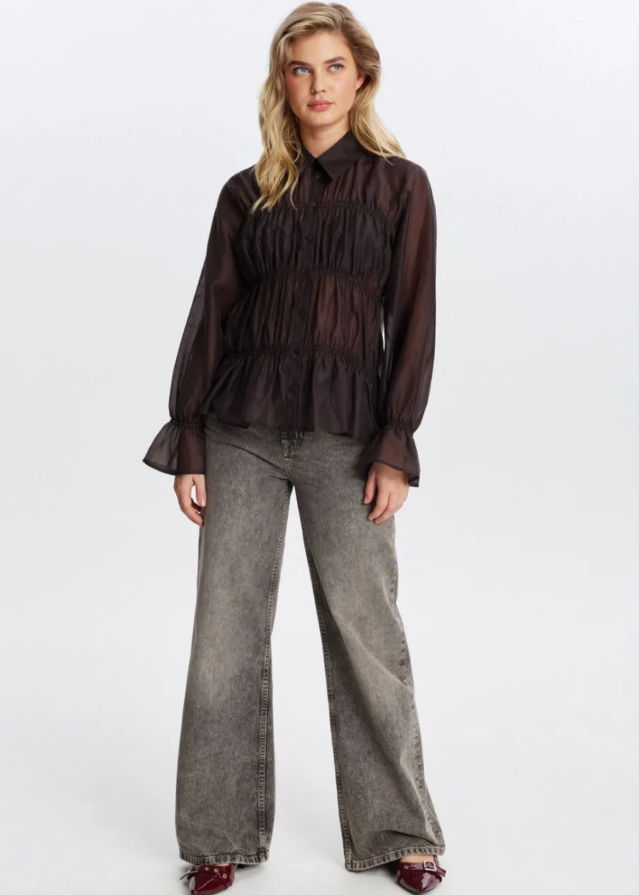 Deze blouse heeft lange mouwen, een kraag en een knoopsluiting aan de voorkant. De blouse is voorzien van ruches en is doorschijnend. Combineer met een jeans voor een casual look.