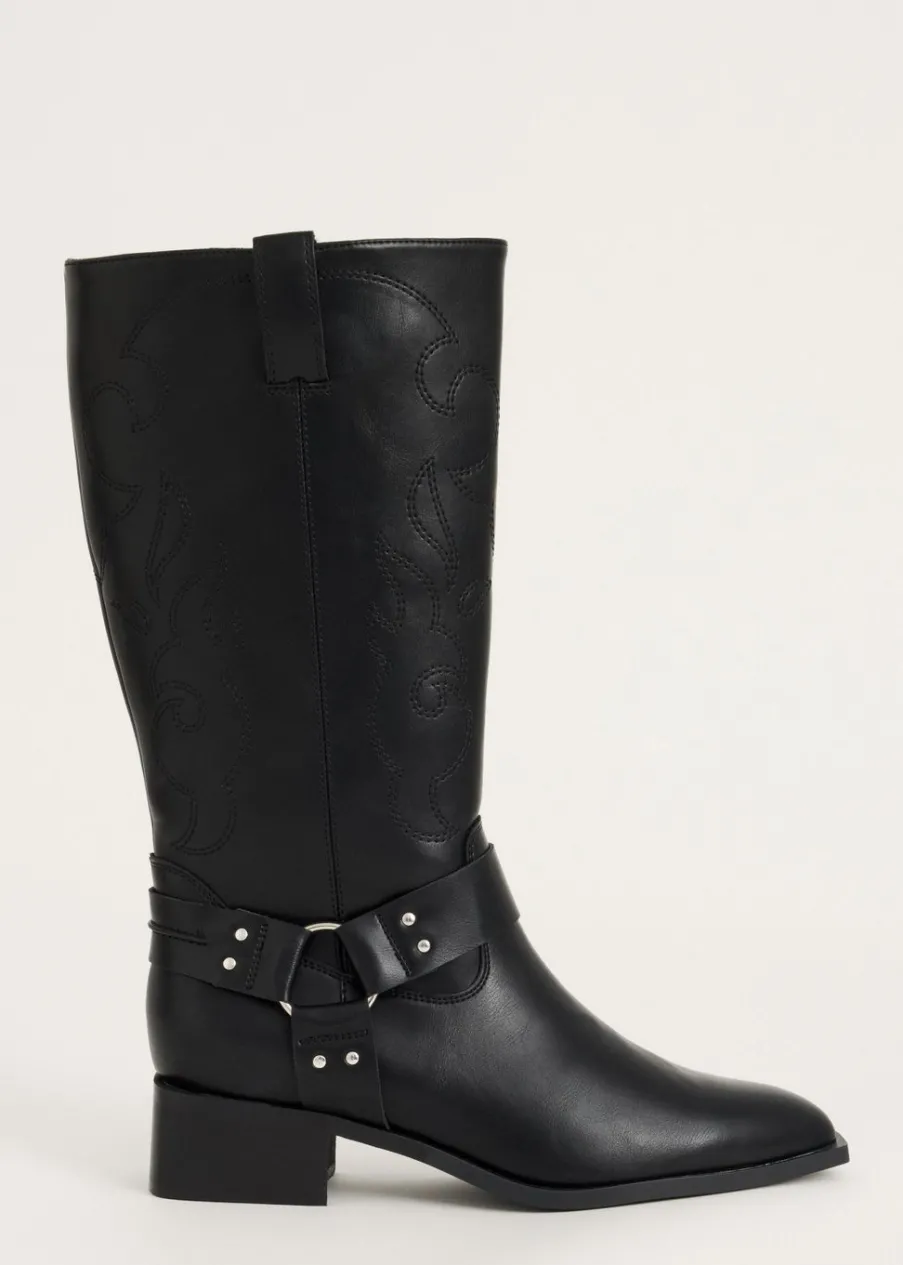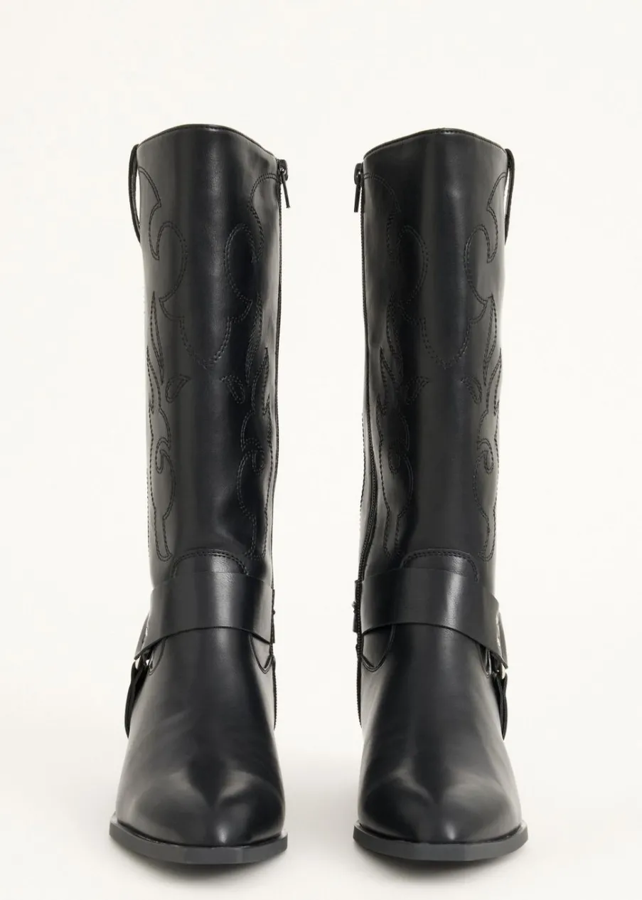Deze hoge laarzen hebben een ritssluiting aan de binnenkant, een stoere western look én een comfortabele hak. Perfect te combineren met een skort voor een edgy touch.