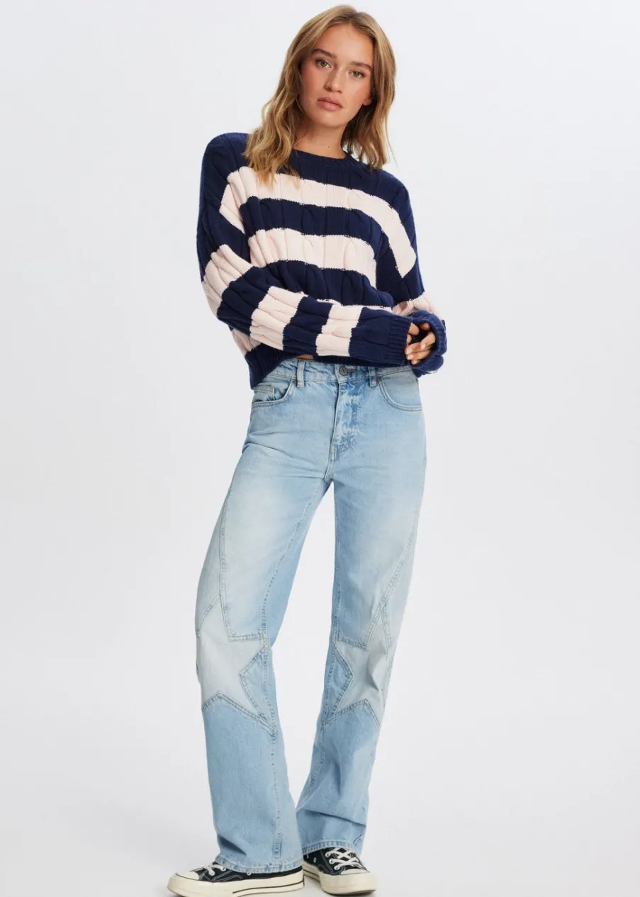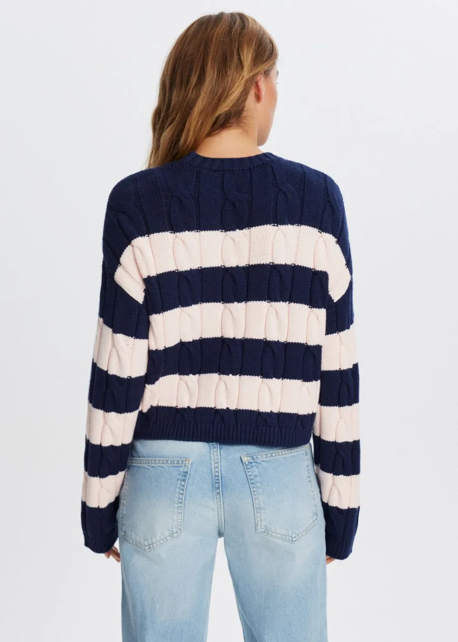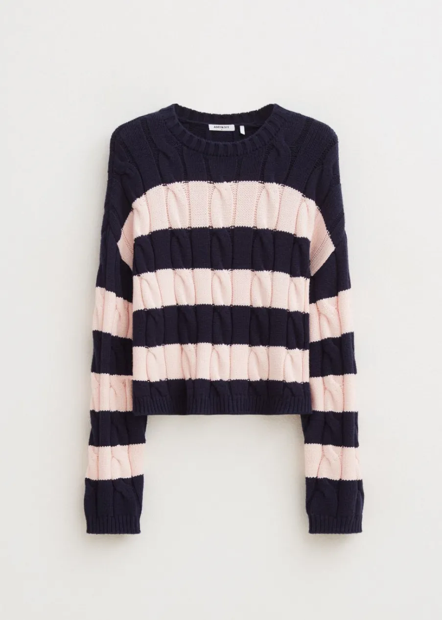 Deze trui heeft lange mouwen, een ronde hals en een cropped pasvorm. De trui is afgewerkt met een kabelpatroon en strepen. Perfect te combineren met je favoriete jeans voor een casual look.