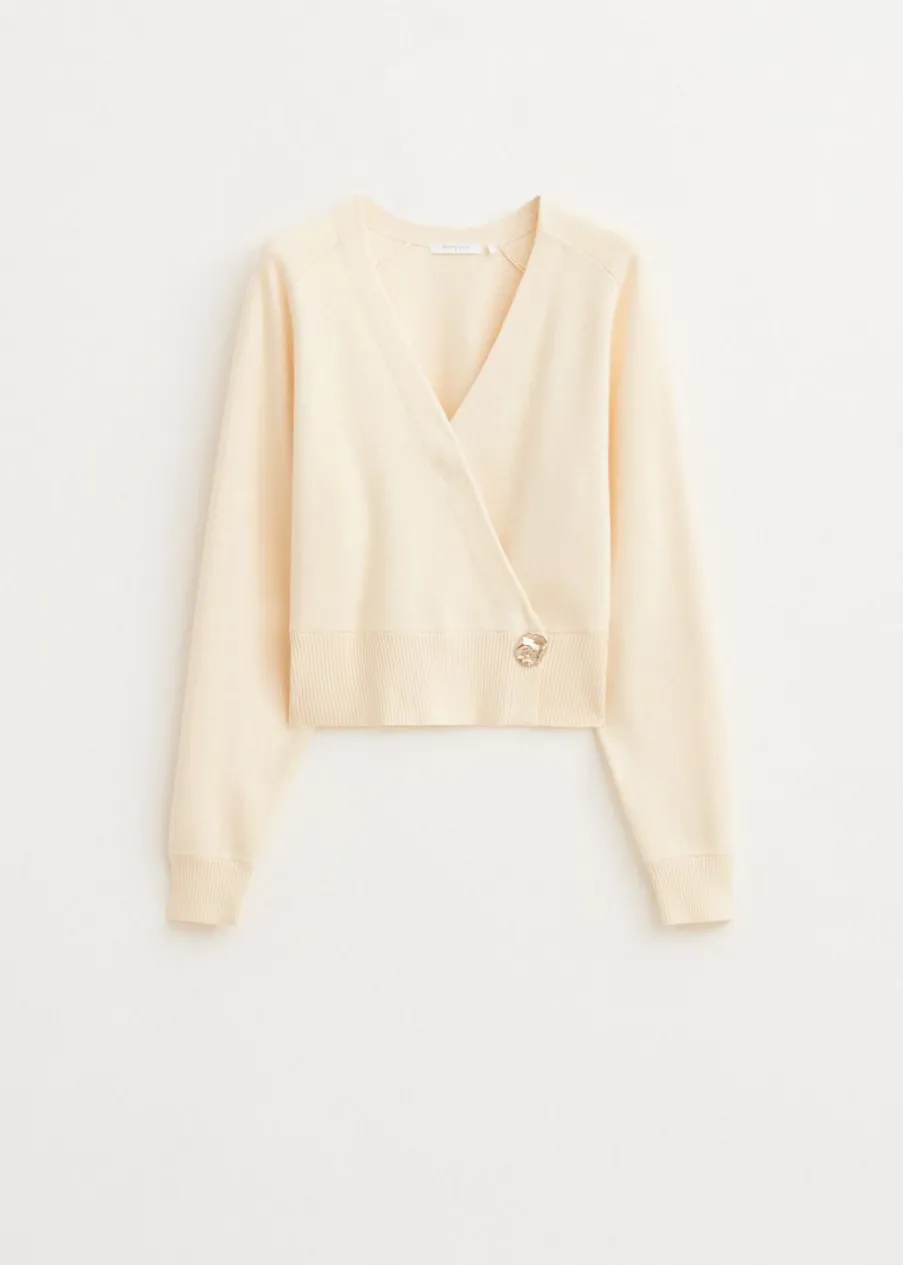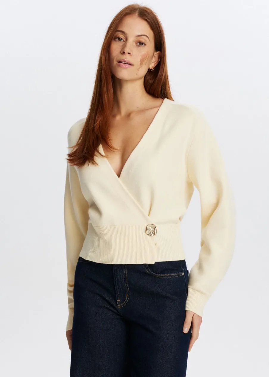 Dit truitje heeft lange mouwen, een normale fit en een lage V-hals. Het truitje is voorzien van een knoop aan de onderkant van de zijkant voor een overlappende fit. Combineer met een jeans voor een stijlvolle look.
