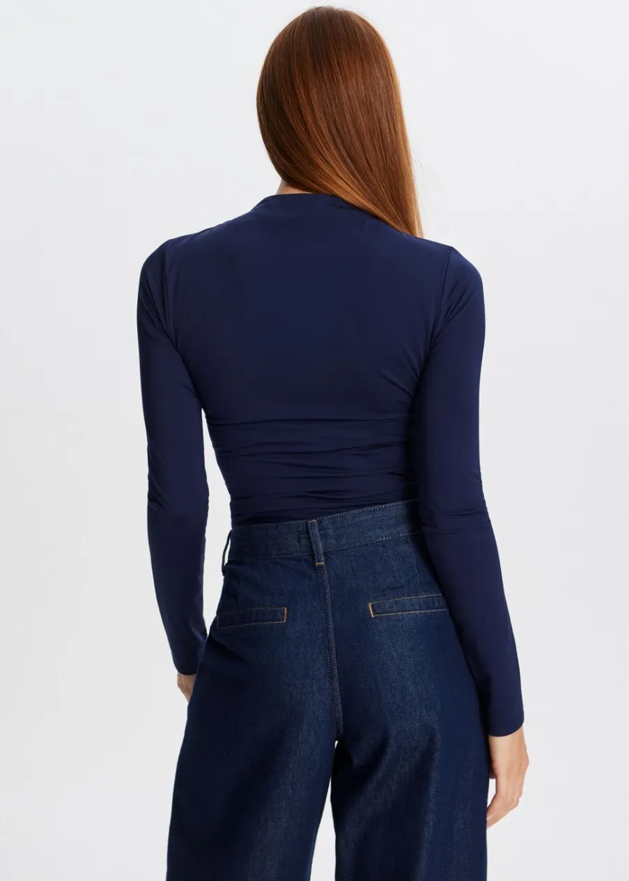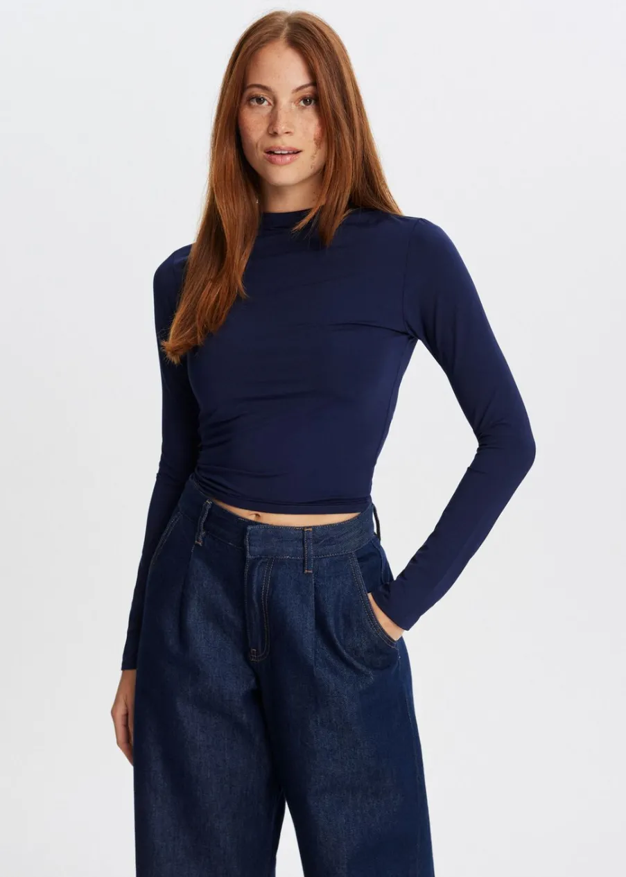 Deze top heeft lange mouwen, een hoge hals en een iets kortere, aansluitende pasvorm. Perfect te combineren met een jeans voor een clean look.