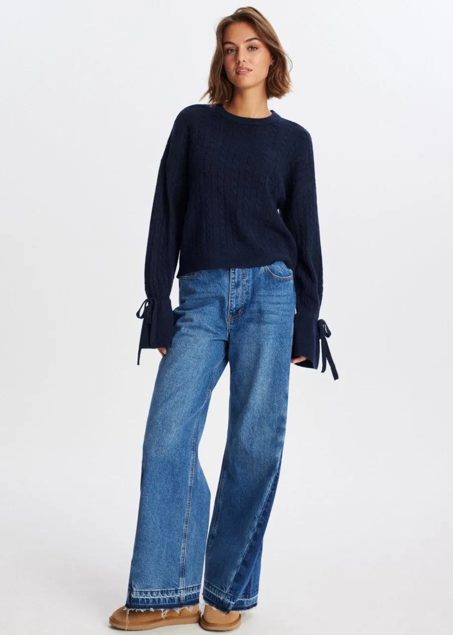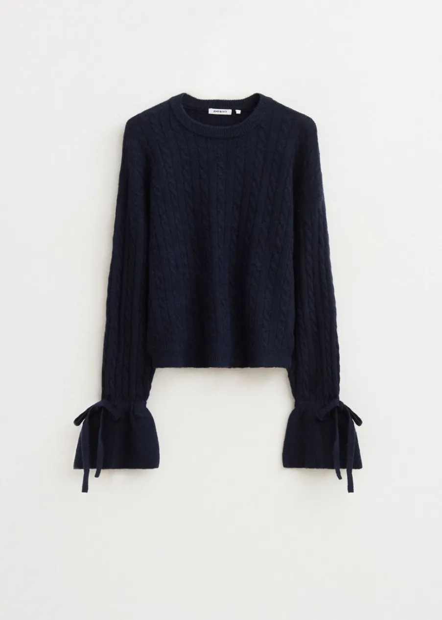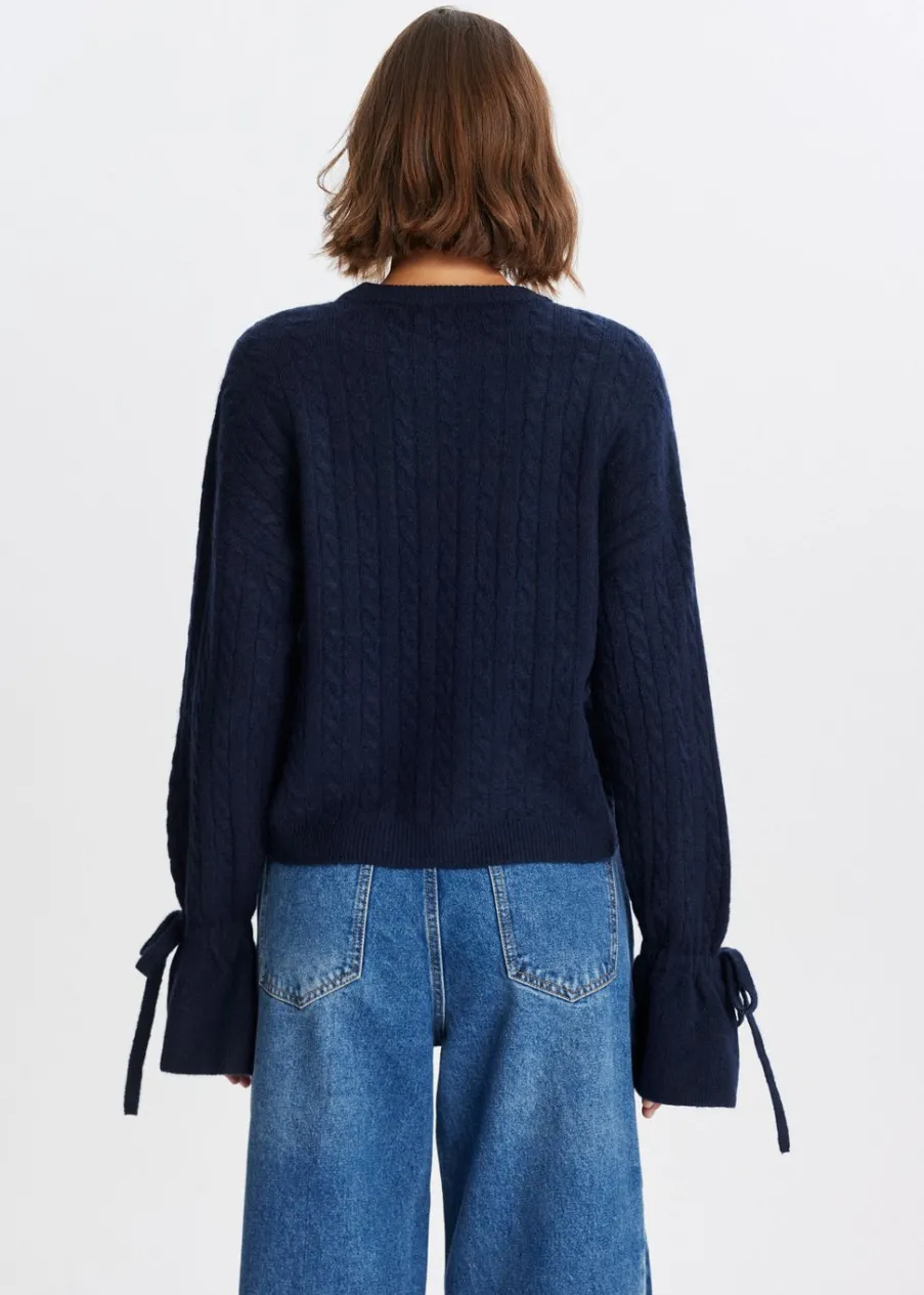 Deze trui heeft een ronde hals en een normale pasvorm. De lange mouwen lopen wijd uit aan de uiteinden en zijn afgewerkt met een strikdetail. De trui is uitgevoerd met een subtiel kabelpatroon. Combineer met een jeans voor een casual look.