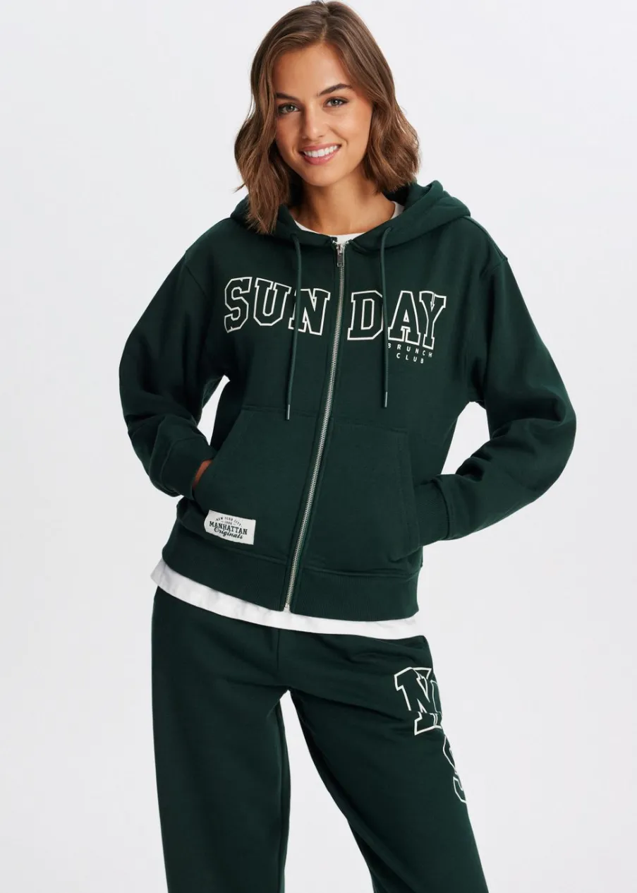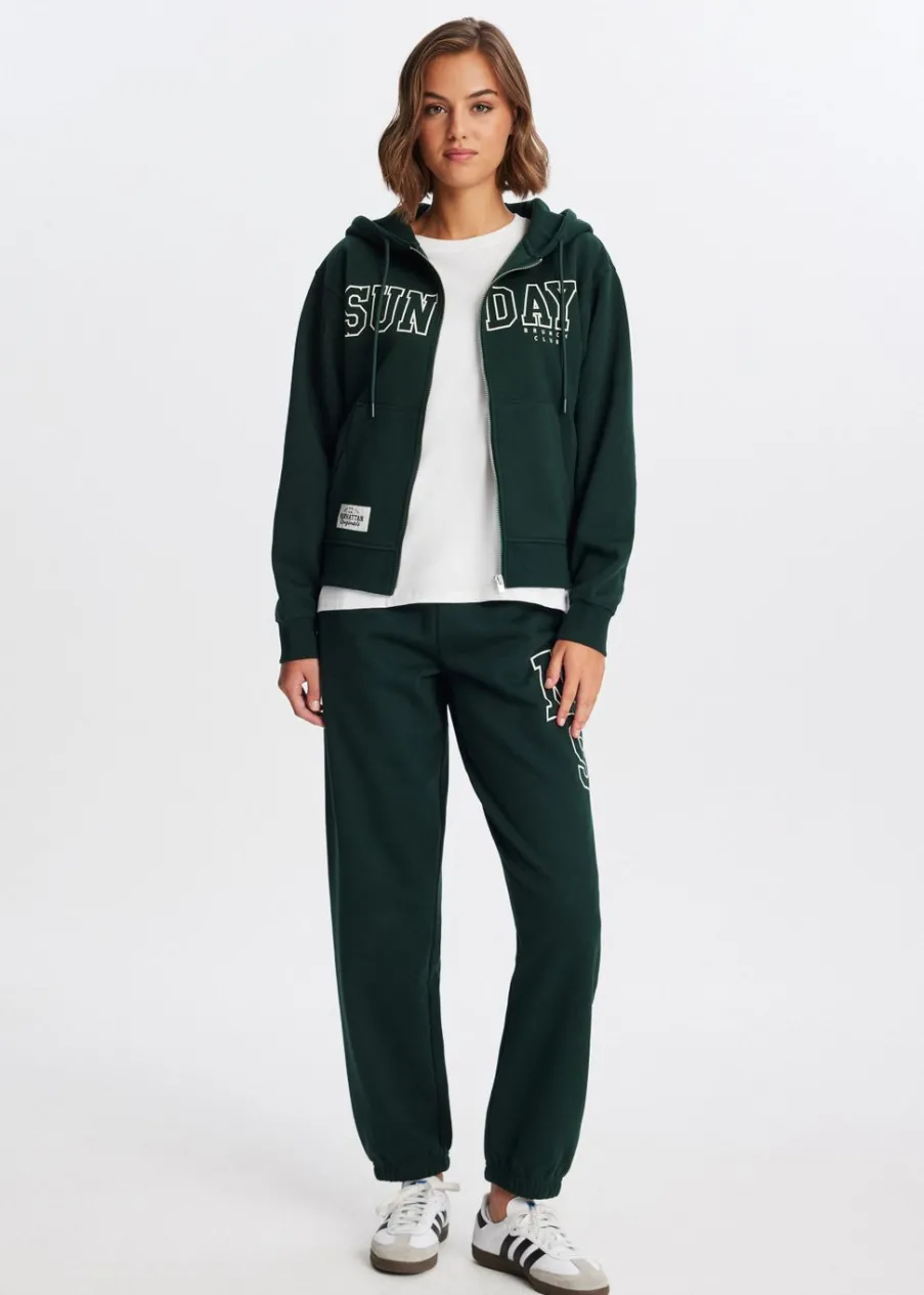 Dit varsity vest heeft lange mouwen, een capuchon met trekkoord en sluit met een rits. Het vest is voorzien van twee steekzakken en een opvallende tekstprint op de voorkant. Bij de groene variant is er ook een cijferprint op de achterkant. Draag het vest samen met een sweatpants voor een comfortabele look.