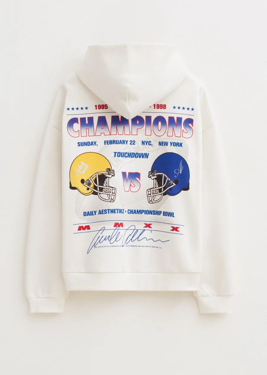 Deze hoodie van Daily Aesthetikz heeft lange mouwen, een capuchon en een relaxed pasvorm. Deze sweater valt op door de grote backprint met de tekst “champions” en rugby helmen. Verder is de hoodie is voorzien van een pouch pocket. Draag deze hoodie met een van onze t-shirts voor een warme outfit.