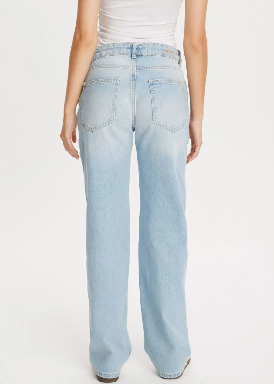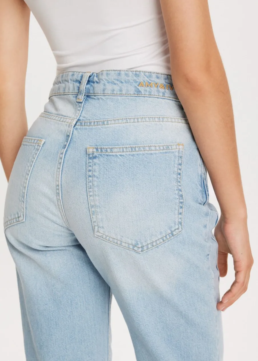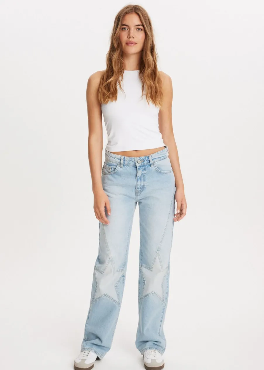 Deze jeans van Amy & Ivy heeft een straight pasvorm en sluit met een knoop- en ritssluiting. De jeans is voorzien van twee zakken aan zowel de voor- als achterkant. Het meest kenmerkende detail zijn de twee opvallende sterren die aan de voorkant zijn aangebracht, wat zorgt voor een speelse touch. Combineer deze jeans perfect met een van onze singlets voor een complete look.