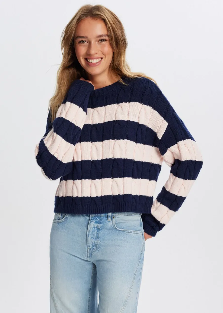 Deze trui heeft lange mouwen, een ronde hals en een cropped pasvorm. De trui is afgewerkt met een kabelpatroon en strepen. Perfect te combineren met je favoriete jeans voor een casual look.