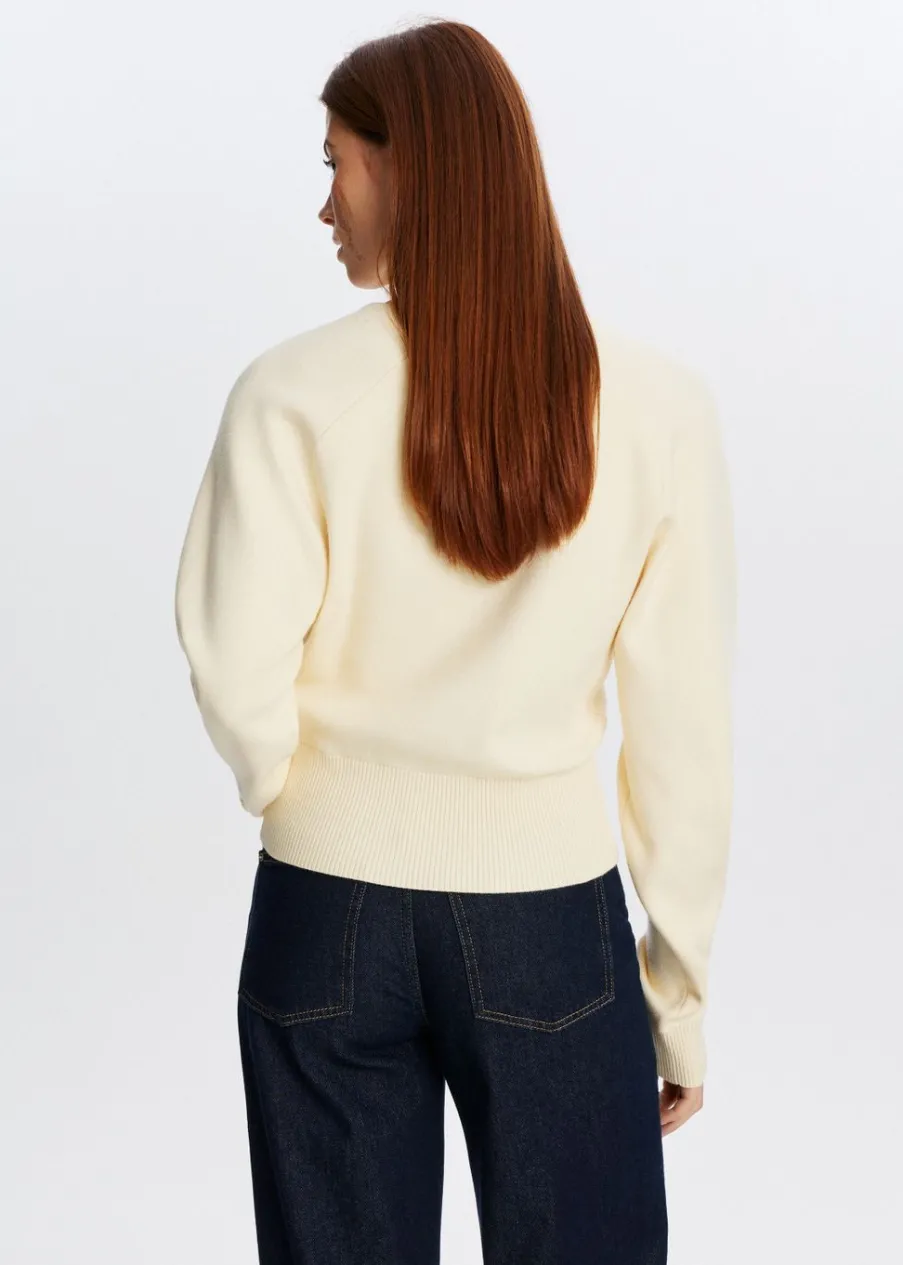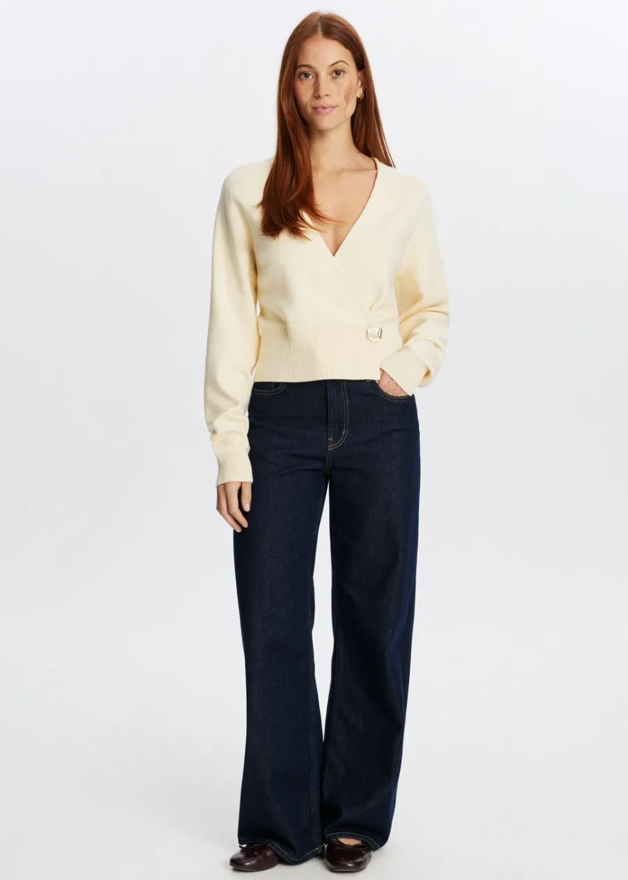 Dit truitje heeft lange mouwen, een normale fit en een lage V-hals. Het truitje is voorzien van een knoop aan de onderkant van de zijkant voor een overlappende fit. Combineer met een jeans voor een stijlvolle look.