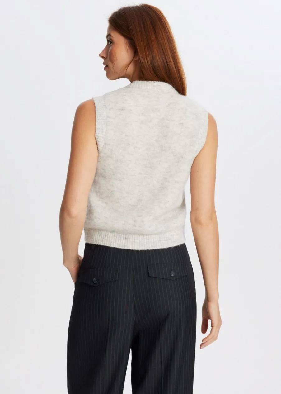 Deze spencer van Melting Stockholm is mouwloos en heeft een ronde hals. Verder is de spencer gemaakt van een zachte wolmix voor een warme fit. Draag deze spencer met een van onze broeken voor een stijlvolle look.