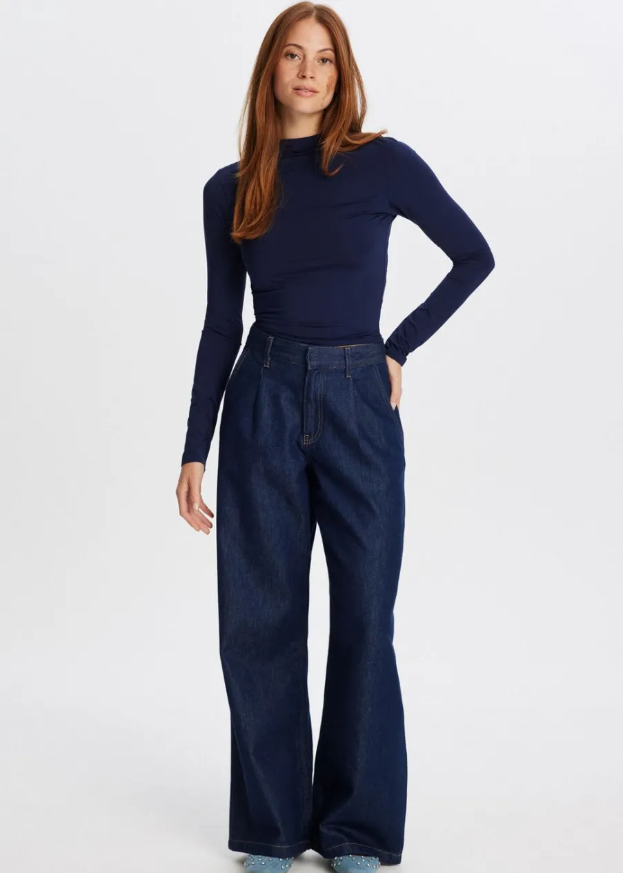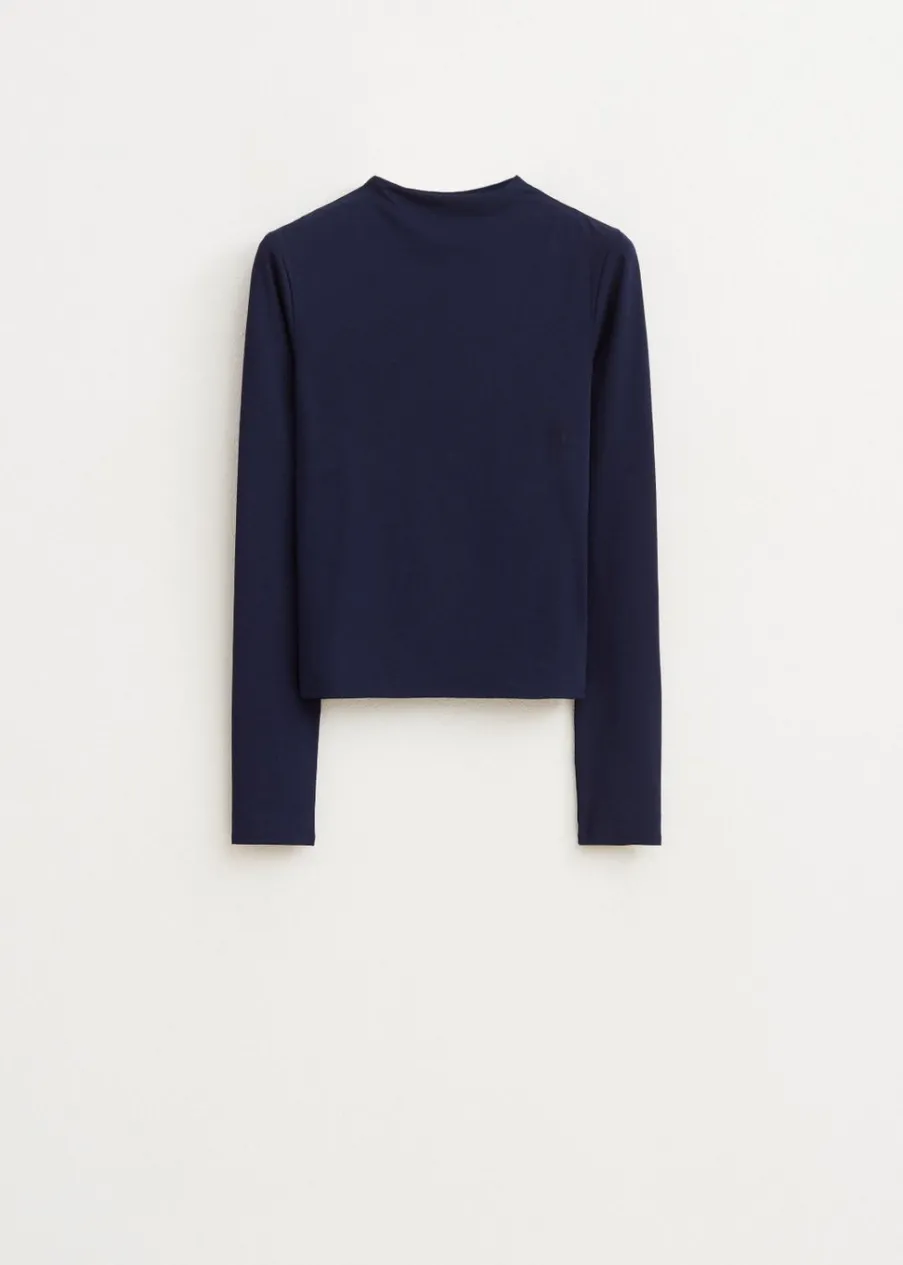 Deze top heeft lange mouwen, een hoge hals en een iets kortere, aansluitende pasvorm. Perfect te combineren met een jeans voor een clean look.
