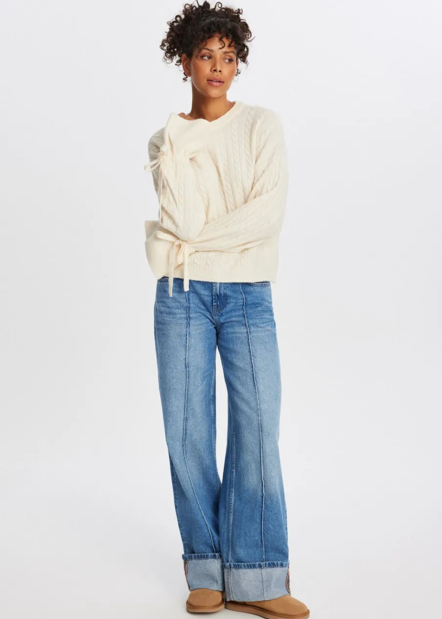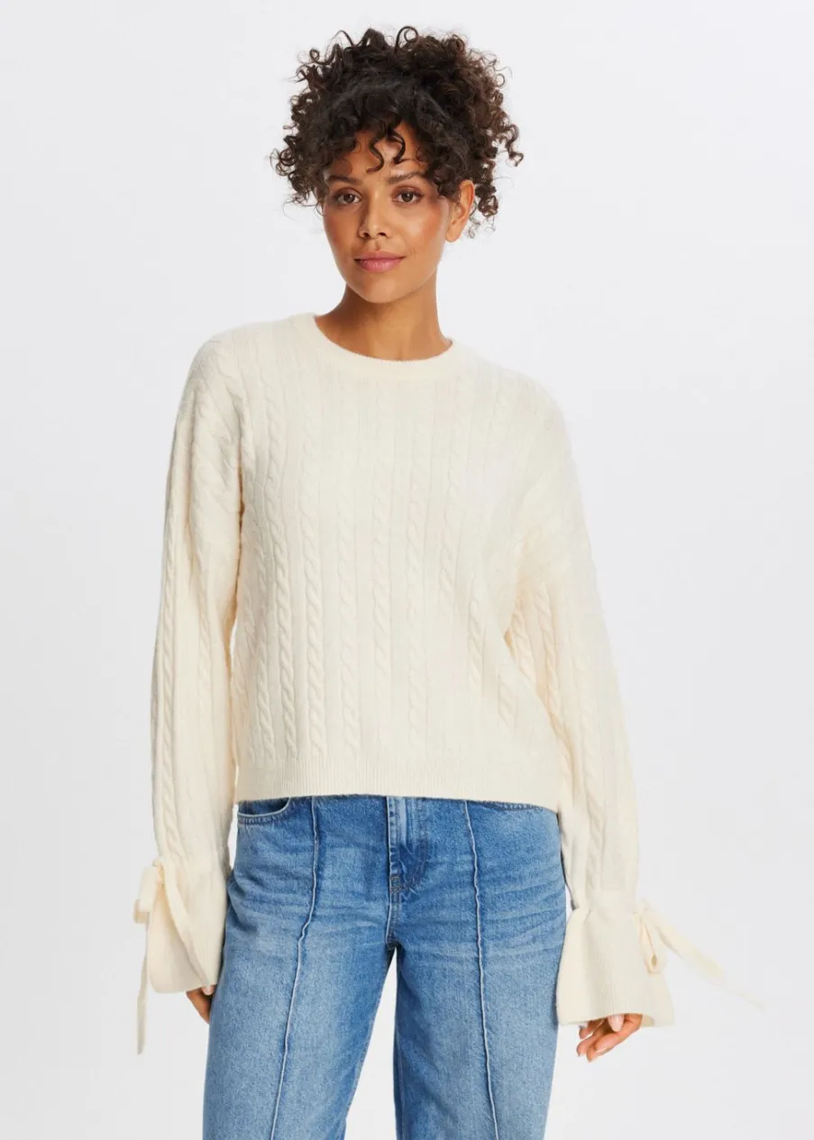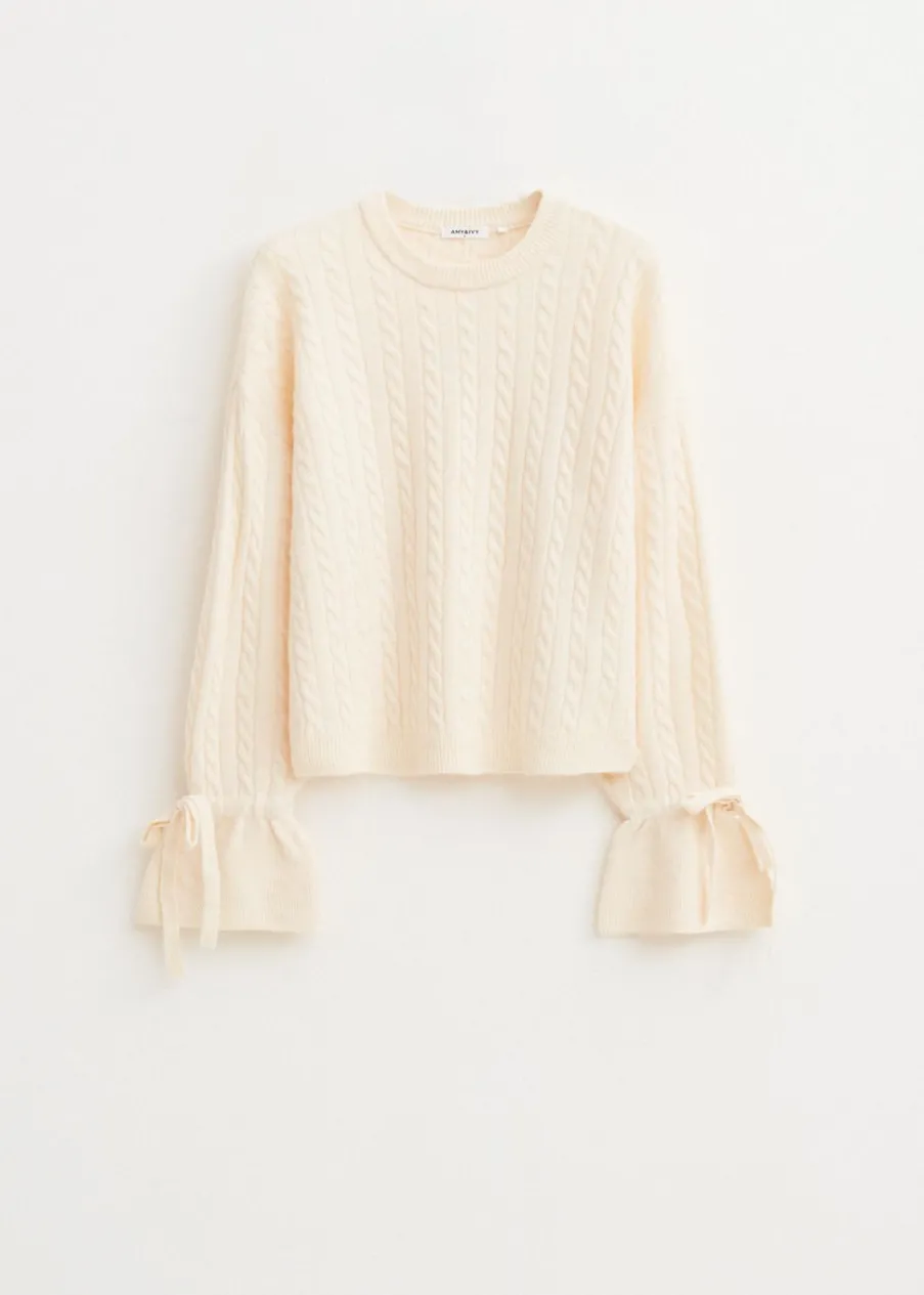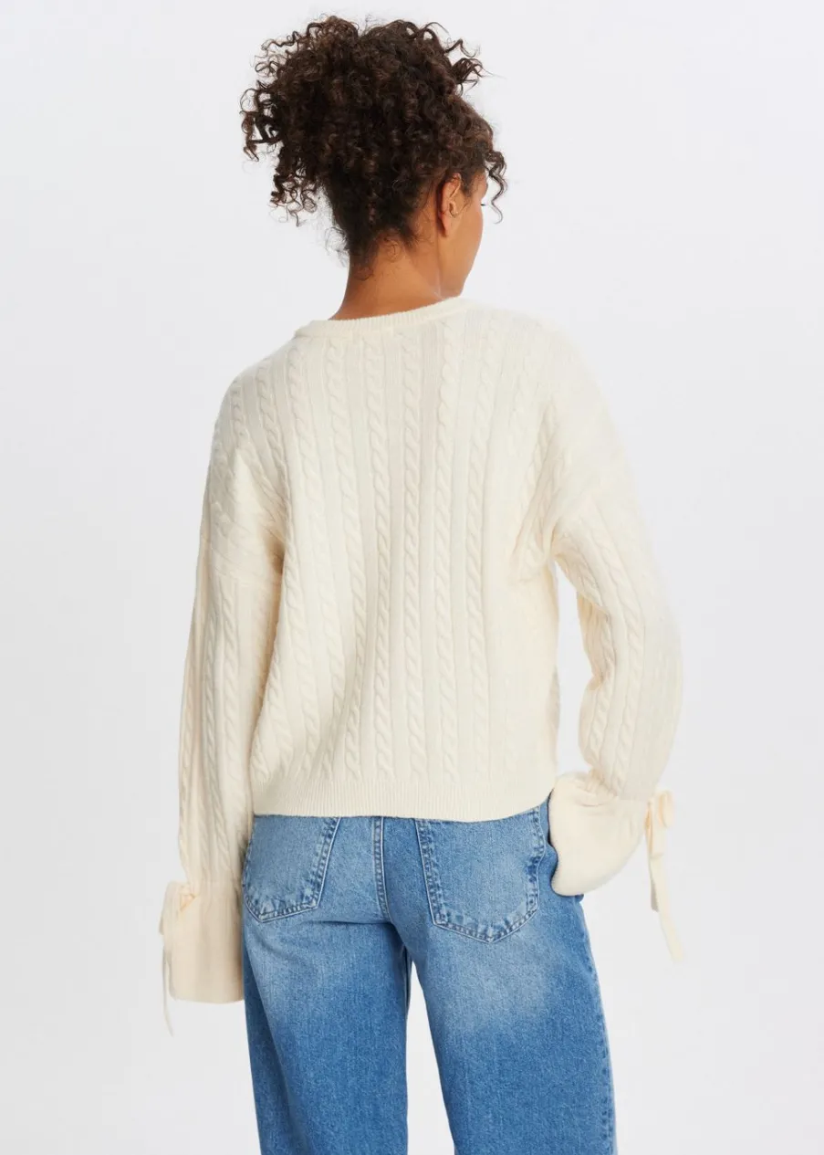 Deze trui heeft een ronde hals en een normale pasvorm. De lange mouwen lopen wijd uit aan de uiteinden en zijn afgewerkt met een strikdetail. De trui is uitgevoerd met een subtiel kabelpatroon. Combineer met een jeans voor een casual look.